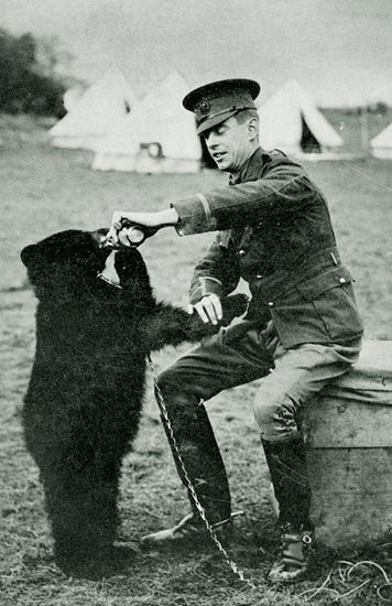 However, perhaps the most beloved Canadian wartime animal was a bear from WWI, Winnie, as in Winnie-The-Pooh. The iconic character created by British author A.A. Milne was based on a real black bear cub from Canada. Purchased in 1914 in White River, Ontario, by a Canadian soldier and veterinarian, Lieutenant Harry Colebourn, Winnie was named after Colebourn’s hometown of Winnipeg. She became a mascot for the Canadian Army Veterinary Corps and accompanied them to England. When Colebourn deployed to the front lines, Winnie moved to the London Zoo where thousands of British children, including A.A. Milne’s son, fell in love with her.